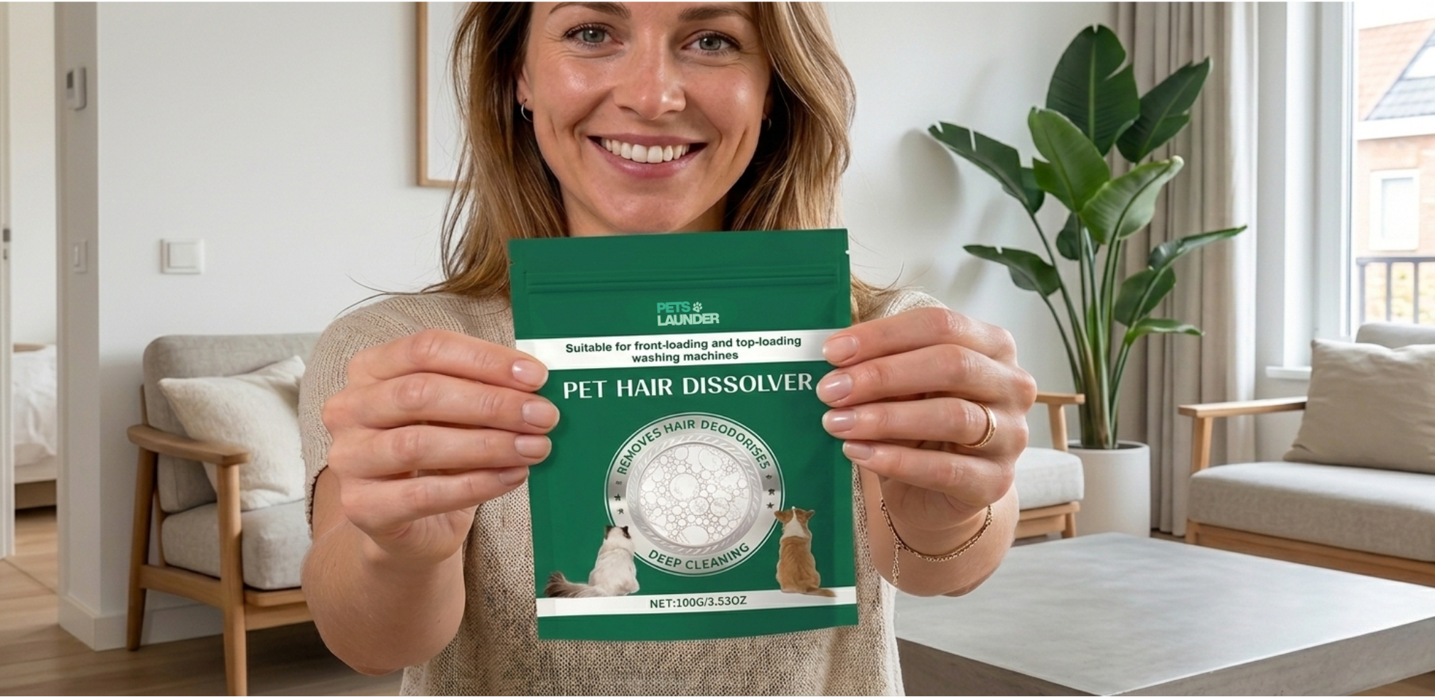 “Vervelende huisdierharen op je kleding? PetsLaunder verwijdert ze moeiteloos in de wasmachine, voor kleding die écht schoon is.”